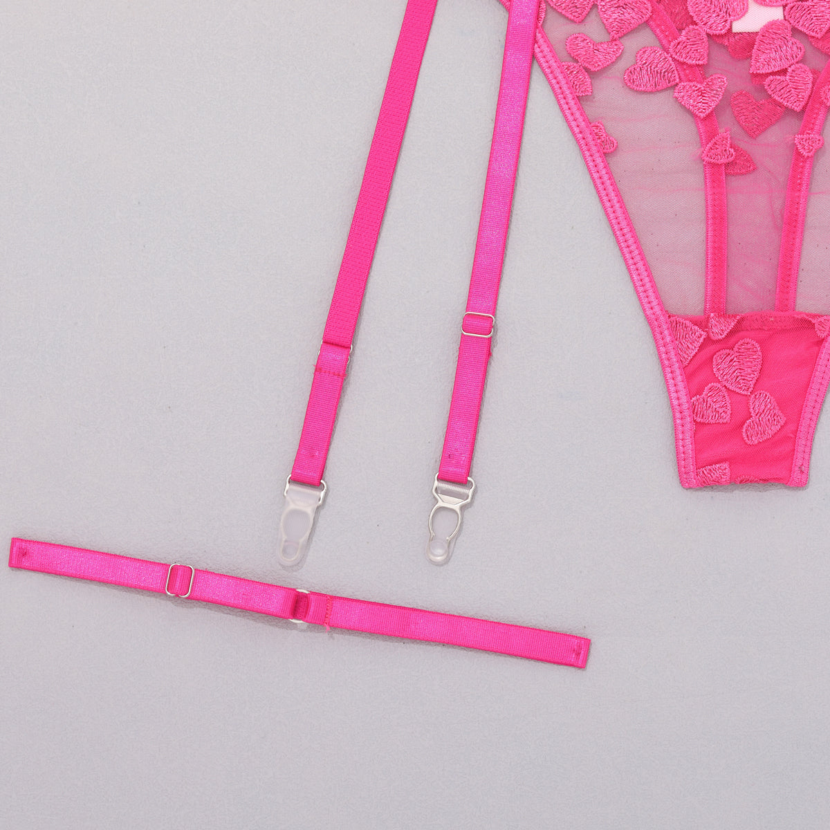 Εντυπωσιακό ροζ σετ με καρδούλες, που περιλαμβάνει ζαρτιέρες, προσφέροντας μια παιχνιδιάρικη και αισθησιακή επιλογή
